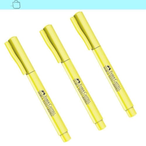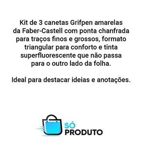 Descrição Destaque suas ideias e anotações com o kit de 3 canetas grifpen amarelas da faber castell. Com ponta chanfrada, essas canetas possibilitam traços finos e grossos de acordo com a posição da ponta no papel. Além disso, o formato triangular garante maior conforto ao escrever e as cores são superfluorescentes. A tinta não passa para o outro lado da folha, garantindo uma escrita limpa e nítida.