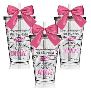 Os Copos Convite são uma forma linda e deliciosa de convidar ou agradecer os pequenos por participarem de uma data tão única Com capacidade de 550 ml, você tem a opção de encher os copos com todo tipo de doce e assim encantar as futuras Daminhas O sim delas será GARANTIDO Personalize também do seu Jeito 3 Copos Convite com Tampa e Canudo Transparentes com 3 Laços em Cetim Rosa. Capacidade: 550 ml Material Copo: Acrílico Poliestireno Resistente Laço: Cetim Cor do Copo: Transparente Tampa e Canudo: Transparente Personalização: Transfer Aplicação Direto no Produto Quantidade: 3 Peças Marca: Não Informado