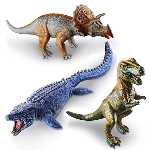 • Este anuncio se trata de um kit que irá com 3 Dinossauros de brinquedos em vinil sendo eles: Mosassauro, Triceratops e Rex.
