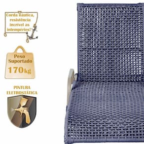 Produto conhecido como: Espreguicadeira reclinavel, Espreguicadeira em aluminio, Espreguicadeira com encosto ajustavel, Espreguicadeira para area externa, Espreguicadeira para piscina, Espreguicadeira resistente ao tempo, Espreguicadeira moderna, Espreguicadeira confortavel, Moveis para area externa, Moveis de aluminio para jardim, Corda nautica para moveis, Espreguicadeira leve e duravel, Design sofisticado para areas externas, Decoracao para varanda e piscina, Espreguicadeira resistente ao sol e chuva