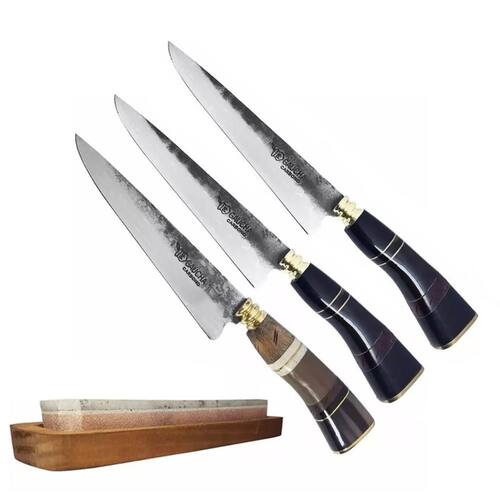 3 Facas Modelo Tesoura Aço Carbono Cabo Chifre E Madeira e Pedra Grês De Afiar Amolar
