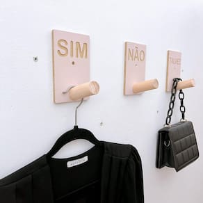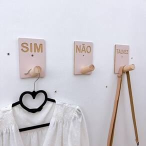 Anúncio se refere à um kit com 3 unidades, sendo: 1 SIM com letras entalhadas 1 NÃO com letras entalhadas 1 TALVEZ com letras entalhadas Tamanho da placa: 10 x 15 cm em MDF laminado Tamanho do pino: 7,0 cm comprimento em Pinus ou Virola (dependendo da disponibilidade) Cor: Rosa bebê (rosê clarinho) Letras entalhadas crua Suporta até 4kg com fita dupla face. Suporta até 10kg com parafuso. Pode ser instalado em divisórias de MDF. Produto vai com parafuso e bucha universal.