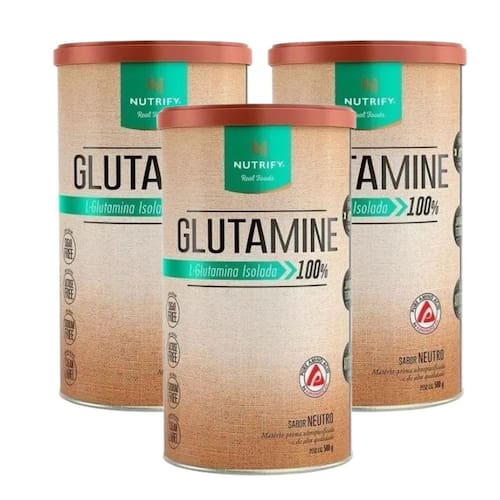 Glutamine 500g L-glutamina Pura Isoada Vegana Nutrify - Kit 3 UnidadesGLUTAMINE NUTRIFY contém 5 g de L-glutamina por porção. Produzido com matéria-prima Ajinomoto de extrema pureza e alta absorção, é isento de glúten, lactose, corantes ou aromatizantes artificiais.A GLUTAMINE NUTRIFY é um aminoácido, um tipo de molécula que desempenha muitas funções no corpo. Seu principal objetivo é servir como blocos de construção de proteínas, substâncias cruciais para nossos órgãos. Mas os aminoácidos também cumprem outras tarefas, como transportar substâncias no sangue e combater vírus e bactérias prejudiciais à nossa saúde.BENEFICIOS: Recuperação muscular Ganho de massa muscular Evita o catabolismo Aumento da imunidade Matéria-prima Ajinomoto Produto vegano 5 g de L - glutamina por porção Isento de glúten, lactose, corantes e aromatizantes artificiais Controla o processo de anabolismo e catabolismo Remove os excessos de amônia e nitrogênio do corpo Regula a síntese e degradação de proteínas Regulação do sistema imune