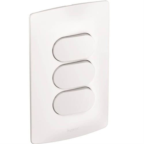 03 Interruptores Paralelos Modular de Embutir 10AX 250V~ com placa, borne com parafuso, distancia normal de abertura dos contatos, tecla basculante, função 06, de concepção A, IPX0, não protegido contra choques elétricos