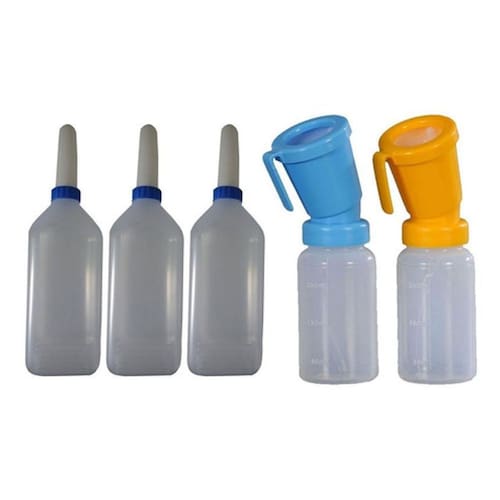 3 Mamadeiras Bezerro 2 Litros + 1 Par Aplicador De Iodo Mamadeira para Bezerro 2 Litros 3 unidades : Não tóxico; Fácil manuseio; Bico de PVC; Fácil higienização e alta resistência; Plástico semi transparente, o que permite fácil visualização do conteúdo; Com graduação numérica em litros para referência da quantidade do conteúdo; Marca: Sgamaq. Aplicador para desinfecção de tetos pré e pós ordenha, Utilizado para redução da contaminação bacteriana Mamite Par : Aplicador Azul para a Pré - Ordenha; Aplicador Amarelo para a Pós - Ordenha; Atenção: Nunca utilizar o mesmo aplicador para as duas operações; Comprimento Total: 21cm cada frasco; Comprimento do reservatório: 11cm cada frasco; Diâmetro interno do bocal: 4cm cada frasco; Diâmetro externo do bocal: 6,5cm cada frasco; Diâmetro externo do reservatório: 6,5cm cada frasco; Capacidade: 250ml cada frasco Possui marcação no frasco para acompanhar o nível do líquido ; Material: Plástico; Fabricante: Injesul. Conteúdo da embalagem: 3 Mamadeiras para Bezerro + 1 Aplicador de Iodo Azul para a Pré - Ordenha + 1 Aplicador de Iodo Amarelo para a Pós - Ordenha. Total 5 Peças.
