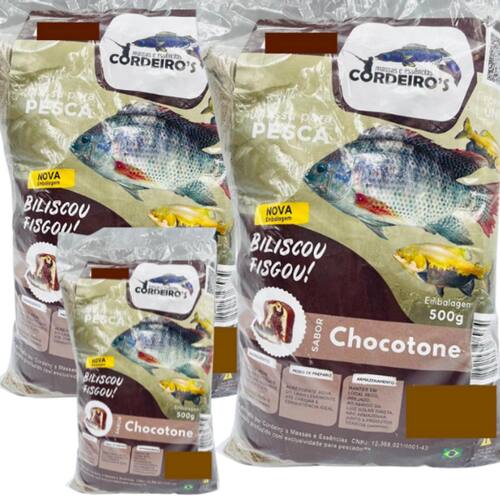 Conteúdo: 3 Pacotes de 500g Massa Cordeiro's Sabor Chocotone super atrativa e excelentes resultados. Uma das mais tradicionais marcas de massas para pesca do mercado.Feitas com matéria prima de excelente qualidade, as massas Cordeiro's são conhecidas em todos os pesqueiros do Brasil e rios pela boa produtividade.Indicada para a pesca de Tilápia, Tambacu, Pacu, Tambaqui, Piauçu, Piava, Piapara, Lambari, Piau entre outros.Especificações:Cada Embalagem com 500gFórmula ÚnicaIngredientes: ração de peixe, farinhas especiais, essências, corantes e proteínas.Modo de Preparo: Acrescente água do lago levemente até chegar a consistência ideal.Modo de Conservação: Manter em local seco, arejado, ao abrigo da luz solar direta.Não armazenar junto a produtos tóxicos.