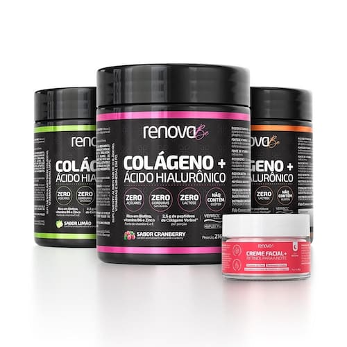 3 potes colágeno verisol renova be + 1 creme facial retinol Sabor: 1 tangerina - 1 limão - 1 cranberry Composto por 3 colágenos + creme retinol - colágeno 216g cada pote - creme 30g O colágeno renova be verisol com ácido hialurônico é um suplemento alimentar de alta qualidade, ideal para pessoas com mais de 19 anos. Com ingredientes como peptídeos bioativos do colágeno e ácido hialurônico, este produto é uma excelente opção para quem busca cuidar da saúde da pele, cabelos e unhas. Além disso, é livre de glúten e não contém lactose, sendo uma escolha segura para quem tem restrições alimentares. A embalagem contém 216g de pó, com uma porção de 12g que fornece nutrientes essenciais como fibras, proteínas, carboidratos e 50mg de ácido hialurônico. Recomendado para fins nutricionais, o colágeno renova be é uma opção prática e eficaz para incluir na rotina diária. Se você busca um suplemento de qualidade para cuidar da sua beleza de dentro para fora, experimente o colágeno renova be verisol com ácido hialurônico. Recomendação de uso - em um copo ou coqueteleira misture 1 colher de sopa aprox.12g em 150ml de água ou leite, consumir uma vez ao dia. Nossa recomendação é sempre usar água gelada. Somente o sabor chocolate contém lactose. Não contém glutén. Advertências: Este produto não é um . Não exceder a recomendação diária de consumo indicada na embalagem. Marca: Não Informado