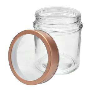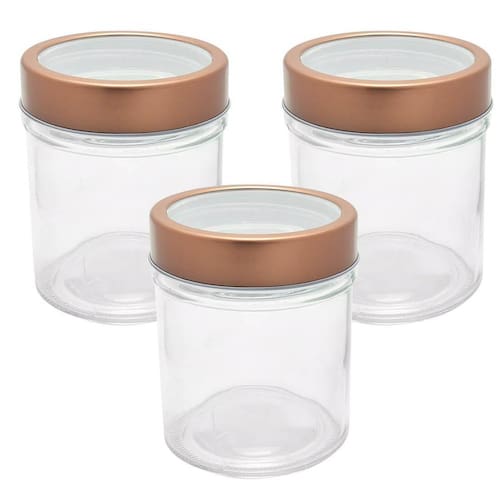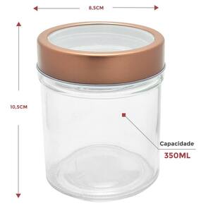 - Kit com 3 potes - Capacidade: 350ml - Tampa rosqueável com visor transparente - Cor cobre - Dimensões: 8,5x10,5cm largura x altura - Composição vidro
