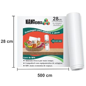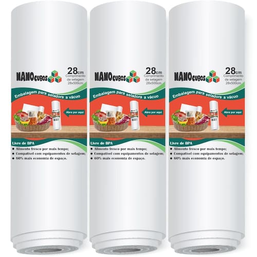 3 Rolos Nanocubos 28x500cm Sacos Ranhura para Seladora A Vácuo Embalagens 3 rolos NANOCUBOS 28 cm X 500 cm para seladoras a vácuo. Embalar produtos a vácuo é a melhor forma de mantê-los sempre protegidos por muito mais tempo. Ao embalar alimentos, a validade deles é completamente estendida, pois eles não terão nenhum contato com o ar e serão pouco afetados pela ação do tempo. Você pode embalar tanto alimentos crus como alimentos já preparados para serem consumidos em outro momento. Você economiza muito dinheiro e evita o desperdício Os sacos para vácuo Nanocubos são produzidos com alta tecnologia em Nylon Poli seguindo padrões de qualidade internacional. Possuem 12 micras, 3 barreiras de proteção, sem presença de BPA Não tóxicos e funcionam com equipamentos de embalagens a vácuo. Além de alimentos, é possível utilizá-lo com objetos pessoais, documentos ou utensílios, conservando-os como novos por muito tempo e aumentando sua vida útil. Características do produto: - Aparência: Transparente com ranhuras; - Forma disponível: Rolos, é possível montar sacos do tamanho que quiser; - Quanto ao uso: Reciclável pode utilizar várias vezes seguidas; - Iniciação ao rasgo: Difícil; - Propagação ao rasgo: Difícil; - Temperatura máxima de uso: 120 C; - Resistência a ácidos: Excelente mantendo o cheiro do alimento; - Resistência a óleos e gorduras: Excelente; - Segurança alimentar: Conserva o alimento. Conteúdo da Caixa 3- Rolos 28 cm X 500 cm. Políticas da loja: - : contra defeitos de fabricação, 90 dias; - Prazo de envio: imediato após a confirmação do pagamento; - Cancelamento: Realizamos a devolução total do dinheiro; Qualquer dúvida estamos à disposição Ean: 7896296916414