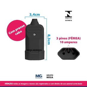 Características: Desmontável Resistente Melhor acabamento do mercado 3 pinos Com prensa cabos Compatíveis com diversos tipos de cabos paralelo, PP plano e PP circular Corpo em material termoplástico de alta qualidade Ligação dos condutores através de bornes parafusados 10A em tensões de até 250V Produtos Certificados pelo INMETRO no requisito de SEGURANÇA pelo organismo de certificação Bureau Veritas BV - OCP0018 Atendem ao padrão brasileiro de plugues e tomadas NBR 14136 Não acompanha cabo Produto testado e aprovado por Mega Aquários Compre nesse anúncio com segurança diretamente com um revendedor oficial Margirius.