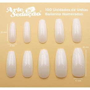 Contém:100 - Unhas Postiças Bailarina Arte Sedução100 - Unhas Postiças Quadrada Arte Sedução100 - Unhas Postiças Almond Arte SeduçãoUnhas Postiças Arte Sedução - As Mais VendidasUnhas Postiças de excelente qualidade, possuem ótimo custo benefício.Perfeitas para quem tem unhas fracas e quebradiças; são super resistentes, protegem e proporcionam o crescimento saudável da unha. Garantem esmaltação impecável e resultado que dura por mais tempo. Indispensáveis para as profissionais que desejam atender todos os desejos de suas clientes ou para você que quer deixar suas unhas lindas e bem feitas no conforto de sua casa.Unhas postiças em tamanhos variados e enumeradas para facilitar a aplicação. Acompanham caixinha acrílica com divisórias que auxiliam no armazenamento.Não acompanha cola.Especificações:Marca: Arte SeduçãoCor: LeitosaComposição: Plástico ABSBoas Compras ;