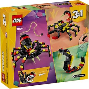 LEGO 31159 - LEGO® Creator - Aranha SurpreendentePrepare-se para uma aventura surpreendente com este set 3-em-1 da LEGO Creator! Construa uma aranha colorida e amigável, e transforme-a em um escorpião ou uma serpente impressionante. Este conjunto oferece horas de diversão e criatividade sem fim! Ideal para crianças a partir de 7 anos que adoram aventuras cheias de imaginação. Características principais:? Aranha para pendurar: Use a teia macia para criar histórias emocionantes. ? Escorpião colorido: As garras móveis permitem encenações dinâmicas e divertidas. Serpente majestosa: Ajustável em diversas formas, perfeita para criar histórias selvagens e divertidas! ? Algumas peças foram reformuladas para criar uma experiência ainda mais envolvente.Benefícios: Desenvolvimento Criativo: Promove habilidades de construção e imaginação. 3-em-1: Três modelos em uma só caixa! Mude de forma sempre que desejar. Este set é um presente irresistível para qualquer fã de animais selvagens! ? Marca: Não Informado