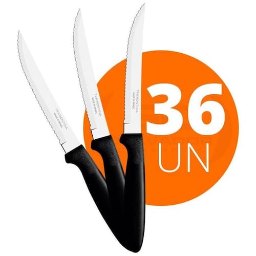 OBS: Veja na descrição os itens que acompanham o jogo. COMPONENTES DO KIT: - 36 Facas para Churrasco Ipanema com Lâmina em Aço Inox e Cabo de Polipropileno Preto 5 - Tramontina 23360405 : 90 dias para vícios ou defeitos de fabricação - Ideal para Restaurante, Lancheria, Paderia, Linha Doméstica, Residência, Gourmet; - Para suas refeições diárias ficarem ainda melhor, você precisa contar com a Faca para Churrasco Tramontina Ipanema com Lâmina em Aço Inox e Cabo de Polipropileno Preto 5 polegadas. - Ideal para lhe acompanhar nas principais refeições do dia, ela é produzida com lâmina em aço inox, que garante mais resistência e durabilidade, além de proporcionar um corte perfeito. - Seu cabo na cor preta é feito em polipropileno e proporciona um manuseio muito mais confortável, além de ser muito sofisticado. - A faca ainda é muito fácil de limpar e pode ir à máquina de lavar louças. - Mais um item Tramontina pensado especialmente em você - A lâmina de aço inox tem maior durabilidade do fio devido ao tratamento térmico. - O cabo de polipropileno possui maior resistência e durabilidade. - Pode ir à máquina de lavar louças facilitando seu dia a dia. - Peso Líquido: 0,023 kg. - Peso Bruto: 0,025 kg. - Dimensões Embalagem : 11cm A x 20cm L x 21,3cm P. - Dimensões Produto 12cm A x 22cm L x 22cm P. Marca: Não Informado