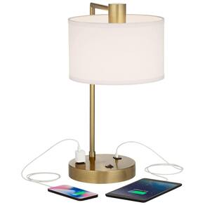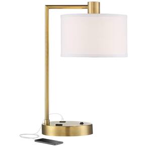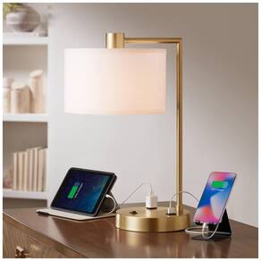 Usa uma lâmpada de base média padrão máxima de 150 watts não incluída. Interruptor liga desliga na base. A base tem uma tomada embutida e uma porta USB 2.0 A. eres. A porta e a tomada USB funcionam se a luz estiver acesa ou apagada. Candeeiro de secretária USB para estação de trabalho. Um design de lâmpada moderno da marca 360 Lighting. Acabamento em ouro antigo quente. Construção metálica. Abajur de tambor não ajustador de linho branco Marca: Não Informado