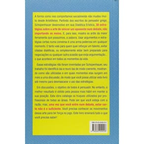 Título do livro : 38 estratégias para vencer qualquer debate Subtítulo do livro : a arte de ter razao Autor : Schopenhauer, Arthur Idioma : Português Editora do livro : Faro Editorial Eireli Capa do livro : Mole Ano de publicação : 2014 Quantidade de páginas : 128 Altura : 210 mm Largura : 140 mm Peso : 190 g Gênero do livro : Filosofia e psicologia Tipo de narração : Conto Idade mínima recomendada : 18 anos Data de publicação : 01-01-2014