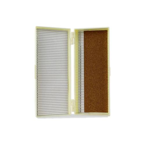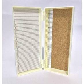 Caixa porta lâminas tipo maleta com capacidade para 50 lâminas de microscopia 26x76mm . Fabricada em polipropileno rígido; Fendas numeradas 1 à 50 para corresponder à folha que se encontra na parte interna da tampa. Cor cinza. Apresentação: unitário Ean: 7792079405130