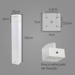 ESPECIFICAÇÕES TÉCNICAS DO POSTE: Cor: BRANCO Aceita lâmpadas LED, Fluorescente ou Incandescente. Material: Alumínio e Policarbonato Bivolt: 110/220 v Soquete: E-27 (Rosca padrão) Tamanho: 50 cm de Altura. Dimensões: 7,5 cm de largura x 7,5 cm de profundidade Utiliza 1 lâmpada E-27