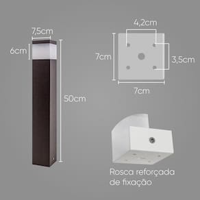 ESPECIFICAÇÕES TÉCNICAS DO POSTE: Cor: MARROM Aceita lâmpadas LED, Fluorescente ou Incandescente. Material: Alumínio e Policarbonato Bivolt: 110/220 v Soquete: E-27 (Rosca padrão) Tamanho: 50 cm de Altura. Dimensões: 7,5 cm de largura x 7,5 cm de profundidade Utiliza 1 lâmpada E-27