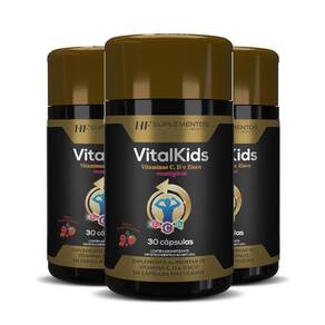 Suplemento alimentar de vitamina c, d, e zinco em cápsulas mastigáveis Pote com 30 cápsulas Ingredientes: óleo de coco, gelatina, óleo de girassol, ascorbato de cálcio, água purificada, amido modificado, , óxido de zinco, colecalciferol, estabilizante carbonato de cálcio, umectante glicerina, glaceante cera de abelha, emulsificante lecitina de girassol, acidulante ácido cítrico, edulcorantes xarope de maltitol, xilitol e sucralose, corantes, carmim e óxido de ferro amarelo, óleo essencial de laranja e aroma idêntico ao natural frutas silvestres Não contém glúten Recomendação de uso: ingerir 01 cápsula ao dia. Através deste anúncio, você está adquirindo 3 três potes de 3x vitalkids vitamina c, d zinco 30caps mastigavel hf suplementos. Marca: Não Informado