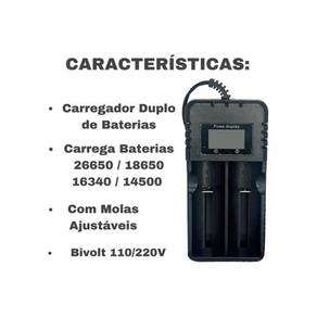 Este anúncio contém: 4 Baterias Recarregáveis 14500 3,7V 3000mah; 1 Carregador Duplo Regulável E Com Visor De Carregamento Para Baterias Recarregáveis 26650 18650 16340 14500. Detalhes do Carregador: Ideal para Modelos 26650 18650 16340 17335 14500; Alimentação Via Cabo Tomada; Molas Ajustáveis e Resistentes; Indicador de carga LCD Exibe dados durante o carregamento; Proteção contra sobrecargas garantindo melhor vida útil das baterias; Voltagem: 110-220V Bivolt; Tensão de saída: 4.2V; Prático e portátil; Carregador de Bateria de Lítio muito prático e conveniente; Carrega ao mesmo tempo baterias de modelos diferentes; Indicado para carregar baterias de lanternas de vários modelos; Com Tela LCD indicador de carga; Detalhes da Bateria: Bateria de alta capacidade; Modelo: 14500; Capacidade: 3000mAh; Tensão: 3.7V; Ponto de proteção de sobrecarga: 4,2v; Ponto de proteção de descarga: 2,7v; Dimensões: Altura: 5 cm; Largura: 1,5 cm; OBSERVAÇÃO: A bateria possui vida útil de 10 anos; Não colocar no fogo; Não desmontar a bateria; Sistema de Proteção contra Curto-circuito; Não misturar baterias novas com baterias usadas; Seja bem vindo Você chegou em uma equipe especializada para melhor te atender. Todas as fotos são de produtos reais e de exclusividade da nossa loja, sendo assim apenas nós temos o direito de imagem sob qualquer mercadoria anunciada. Veja nossos outros produtos um pouco mais abaixo em Mais Anúncios do Vendedor. Você chegou até aqui se você tem alguma dúvida pendente sobre o produto anunciado nos diga. Estamos sempre aqui para lhe responder sempre A Nossa empresa é extremamente profissional e especializada com produtos de alta qualidade, pois nosso objetivo é ver vocês clientes satisfeitos com os produtos e atendimento. Já as compras efetuadas depois das 13h, sabados, domingos e feriados, serão enviadas no próximo dia útil. Vocês enviam para todo o Brasil Quanto fica o e qual o prazo de entrega R: Enviamos para todo o Brasil. Para conferir o ou o prazo basta verificar no campo acima, ao lado das fotos, ou entrar em contato conosco para mais informações, caso ainda tenha dúvidas. Todos nossos produtos possuem . Esse produto vem bem embalado R: Sim, todos nossos produtos são muito bem embalados para evitar qualquer chateação para nossos clientes. Ele vem igual está na foto R: Sim, as fotos de nossos produtos são tiradas por nós, para garantir melhores detalhes de informações visuais, garantindo assim melhor entendimento de como realmente é o produto. Marca: Não Informado