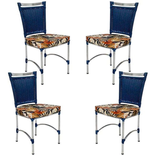 Características:Peças produzidas em alumínio e revestidas em fibra sintética com proteção uv.Nossos produtos são artesanais e podem ocorrer variações na medida de até 2cm.As cores dos produtos podem variar de acordo com o ambiente e com a iluminação em que as fotos foram tiradas.Ideal para ambientes internos, varandas, edículas, área de lazer, salas de estar, sala de jogos, churrasqueiras, sala de filme, recepção, sala de espera entre outros. Itens inclusos: 04 cadeira JK em alumínioDimensões:Altura total: 94 cmLargura: 48 cmProfundidade: 45 cmPeso: 23 kgSuporta até 180 kg Dúvidas frequentes:Quais as cores disponíveis?Temos 11 opções de cores disponíveis para a fibra sintética.Como escolher a cor do produto?Após a confirmação do pagamento ficará disponível um campo de mensagens entre o vendedor e o comprador, por lá será acertado todos os detalhes referentes as cores do produto escolhido antes de ser encaminhado para a produção.Os produtos podem ficar expostos ao tempo?Sim, a estrutura de alumínio pode ser molhada e utilizada em áreas abertas, exposta ao sol e chuva. A fibra sintética possui filtro UV, com isso o produto pode ficar tranquilamente exposto ao tempo sem que o mesmo danifique-o.