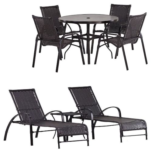 Conteúdo da Embalagem: 02 Espreguiçadeiras Garden COM PINTURA 01 Mesa de centro Garden COM PINTURA 04 Cadeiras Emily Alumínio COM PINTURA 01 Mesa Roma Adaptada com tampo ripado de 1 Metro de Diâmetro COM PINTURA