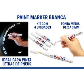 Destaque suas rodas e dê um toque personalizado ao seu carro ou moto As Canetas Paint Marker Brancas são ideais para pintar e realçar as letras dos pneus, garantindo um visual esportivo, moderno e cheio de estilo. Além disso, ficaram famosas no mundo sneakerhead, perfeitas para customizar solados de tênis Boost, , e outros . Com tinta permanente à base de óleo, são resistentes à água, não desbotam facilmente e garantem acabamento uniforme e duradouro. Diferenciais do Produto Kit com 4 unidades - melhor custo-benefício. Tinta à prova dágua e permanente. Ideal para pneus de carros e motos. Muito Utilizado para customização de tênis. Corpo em alumínio resistente. Ponta média de 2 a 3 mm, fácil de controlar. Indicações de Uso Pintar letras de pneus carros e motos . Customização de tênis e solados. Personalização de objetos, plásticos e metais. Desenhos e artesanato em geral. Modo de Usar Agite bem a caneta antes de usar. Pressione a ponta contra um papel até a tinta descer. Aplique na superfície limpa e seca. Espere secar e pronto Quantas canetas preciso para pintar 1 pneu de moto 1 caneta para contorno. 2 canetas para preenchimento completo. Quantas canetas preciso para pintar os 4 pneus do carro 4 canetas para contorno. 5 a 6 canetas para preenchimento completo. Especificações Técnicas Condição: Novo, lacrado. Cor: Branco. Tipo: Acrílica à base de óleo. Espessura da ponta: 2 a 3mm. Garanta já o seu kit e deixe seu carro, moto ou tênis com um visual único e estiloso Marca: Não Informado Ean: 7891929929588