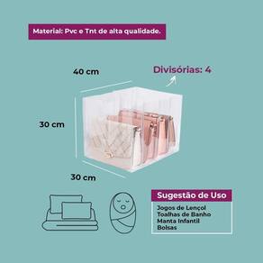 4 quatro colmeia organizadora gaveta bolsa multiuso 4 nichos 40x30x30 Transparente com viés branco Usar colmeias é a forma mais moderna de organizar os guarda-roupas e closets. A colmeia organizadora de gaveta 40x30x30, com 4 divisórias, é ideal para organizar bolsas, jogo de lençol, toalhas, blusão lã, mantas, dentre outros. São práticas e resitêntes: - a transparência da colmeia facilita a visualização e setorização das peças ; - possui um bom tamanho e são multiuso; - otimizam o espaço; e - facilitam o seu dia a dia. Limpeza: limpar tudo com pano úmido. Não utilizar produtos químico. Excelente também para ser em organização de espaço por personal organizer. Modelo: colmeia organizadora gaveta Material: plástico transparente reforçado e viés em tnt de alta qualidade Divisórias: 4 nichos separadores em cada organizador Medida comprimento x largura x altura : 40x30x30 cm Cada embalagem contém: 1 colmeia organizadora grande Marca: Não Informado Ean: 7908788501050