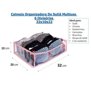 4 quatro Colmeia Organizadora De Sutiã Multiuso 6 seis Divisórias 32x10x22 Transparente Com Viés Rosa Com praticidade e organização, tamanho certo, arrume seu guarda-roupa com colmeia de 6 divisórias e ganhe mais tempo para você Organizador em Colmeia Cristal 6 seis nichos permite melhor visualização e organização de suas roupas e peças íntimas, facilitando o seu dia a dia. Possui boa sustentação para acomodar as roupas, costuras reforçadas o que garante maior durabilidade. É confeccionado em plástico PVC, material resistente e transparente. Ideal para sutiã com bojo, chinelos, rasteirinhas, camisetas, blusinhas, roupa de academia, toalhinhas, roupinhas de bebê, meias, calcinhas, dentre outros. Com nossa colmeia organizadora, suas roupas estarão sempre no lugar certo e fáceis de encontrar. Organizador de sutiã cristal com rosa Tamanho: 32x21x10 6 divisórias Marca: VB Home Material resistente: PVC cristal transparente de alta qualidade Limpeza: Limpar tudo com pano úmido. Não utilizar produtos químico. Excelente também para ser em organização de espaço por Personal Organizer. Marca: Não Informado Ean: 7908788501081
