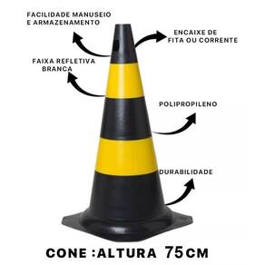 Cone: 75 cm Corrente: 20 mTS Elo GRANDE Cor: Zebrado Preto e Amarelo Marca: kteli Material: PVC Rígido confeccionado com um composto plástico de alta durabilidade e resistência, possui alta visibilidade para sinalização