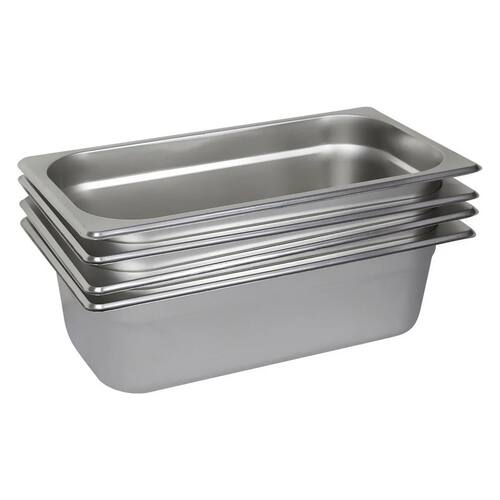 Kit com 4 cubas GN 1/3 de 100mm. Ideal para molhos, proteínas e acompanhamentos com durabilidade e encaixe GN.