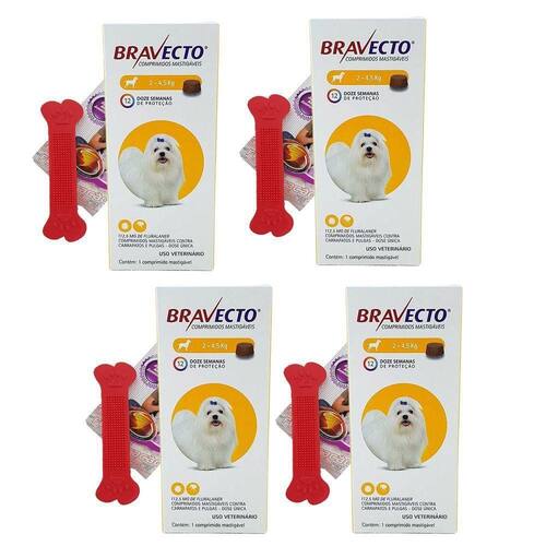 4cx Bravecto Comprimido Antipulgas Cães 2 A 4,5kg Msd + 4 brinquedos Bravecto comprimidos mastigáveis da MSD Saúde Animal com longa duração de ação que promove eficácia imediata e persistente por 12 semanas contra pulgas e carrapatos. KIT contendo 4 unidades Bravecto Comprimido Cães 2 A 4,5kg + 4 brinquedos de borracha