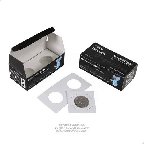 O Coins Holder Grampeável é uma importante ferramenta para armazenar e proteger suas Moedas. É um produto utilizado por colecionadores e coleções de todos os níveis: do iniciante ao avançado. Garante o bom armazenamento e proteção de suas peças.O Coins Holder tem como função proteger sua moeda:- evita o contato com o ambiente externo- evita o manuseio incorreto da peça (sem luvas ou com a mão suja)- facilita a exposição de sua peça na sua coleção- facilita a logística de sua peça, permitindo que você leve em eventos ou para negociar com mais praticidade e proteção- excelente organizador, pois centraliza a moeda no bolso da folha, deixando sua exibição muito mais bonita, organizada e apresentávelNo critério de organização, o Coins Holder se destaca ao promover a padronização da exposição de suas moedas. Tenha uma apresentação muito mais bonita e profissional utilizando Coins Holders.CARACTERÍSTICAS:Modelo: Fixação por GrampoMaterial: Papel Cartão Branco com Película de PolipropilenoDimensão Cartão Aberto: 10x5cmDimensão Cartão Fechado: 5x5cmDiâmetro deste Anúncio: Ø 25mmEmbalagem: Caixa com 50 alvéolos (coins holder) cada caixaOBS: Isento de PVCSUGESTÃO DE ARMAZENAMENTO DO COINS HOLDER COM A MOEDAO Coins Holder pode ser armazenado em folhas próprias para coleções de Moedas respeitando o espaço mínimo de 5x5cm cada bolso onde o holder será colocado, caixas organizadoras e separadoras, estojos (cartelas dobráveis) próprios para Coins Holders.COMO UTILIZAR:1- Para utilizá-lo você deve primeiramente dobrar ao meio, na marcação indicada, para facilitar o fechamento com a moeda.2- Em seguida, você deverá posicionar a moeda no centro do Coins Holder, em cima da película de plástico, onde a moeda será exibida. Certifique-se de que sua moeda está perfeitamente alinhada com alguma das laterais do Coins Holder pois após fecha-lo, não conseguirá mais mover a moeda. 3- Dobre o coins holder ao meio, por cima da moeda, envolvendo-a completamente.   4- Com um grampeador, grampeie a parte branca do Coins Holder. É sugerido que o grampo seja aplicado bem posicionado entre a moeda e o final do Coins Holder, pois assim prenderá corretamente a peça evitando que a mesma movimente. Também é sugerido 4 grampos para o bom fechamento do Coins Holder, mas fica a critério de cada colecionador.