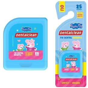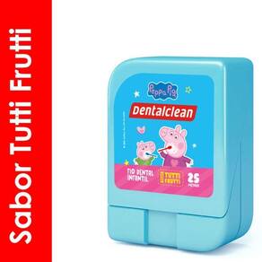O fio dental infantil Peppa Pig possui 25 metros e sabor tutti frutti, ideal para incentivar o hábito de usar fio dental desde pequeno.