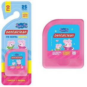 4 fio dental infantil - peppa pig - 25m - rosa - dentalclean 4 x fio dental infantil - peppa pig - tutti frutti - 25m - rosa - dentalclean O fio dental infantil peppa pig possui 25 metros e sabor tutti frutti, ideal para incentivar o hábito de usar fio dental desde pequeno. Este item foi desenvolvido para ajudar os pais a completarem a higienização bucal das crianças. O fio dental infantil deve ser utilizado preferencialmente antes da escovação, depois de cada refeição. No mínimo, é recomendado passar o item uma vez ao dia entre os dentes, na escovação noturna. Entre os dois e seis anos de idade, os dentes começam a se encaixar um do lado do outro o que aumenta as chances de restos de alimentos ficarem presos nos dentes. À medida que as crianças vão desenvolvendo suas habilidades, é indicado dar sequência ao hábito de modo independente. Geralmente, as crianças conseguem dominar o uso do fio dental por conta própria por volta dos oito anos de idade.