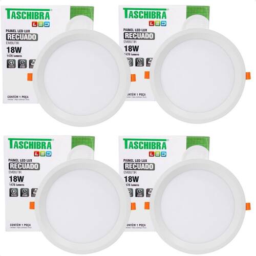 Kit 4 Painel de Led Redondo Embutir Recuado 18W Bivolt Taschibra 6500K Frio Características Gerais do Produto: Dimensões AxLxP CM : 1,6 x 17 x 17 Formato: Redondo Nicho do recorte CM : 15,5X15,5 Cor da luz: 6500K Frio Produzido em: Plástico de Engenharia, Anti-UV, Driver Onboard, Placa Interna em Alumínio e Componentes Eletrônicos Voltagem: Autovolt Utilizado em 110v e 220V Alimentação: Energia elétrica Cor acabamento: Branco Potência: 18W Fluxo luminoso: 1476 Lumens IRC: 80 Ângulo de abertura: 120 : 1 ano junto ao fabricante Aplicação: Embutir Vida útil: 20.000 horas Acompanha lâmpada: Não necessita, LED já integrado Grau de proteção: IP20 Ajuste de intensidade Dimerizar : Não Acompanha o produto: 04 Painel Led Completo : 1 ano junto ao fabricante