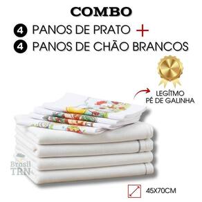 4 Panos de Chão Brancos Alvejados Duplo Costurado + 4 Panos de Prato Branco Pé de Galinha - Combo com 4 Panos de Prato mais 4 Panos de Chão Brancos, qualidade, praticidade e eficiência que você sente no dia a dia Quem cuida da casa sabe: pano ruim atrasa a limpeza, espalha sujeira e se desfaz rapidinho. Chega de frustração Este combo foi pensado pra quem quer produtos que realmente funcionam, duram e facilitam a rotina sem gastar muito. - Panos de Prato Pé de Galinha - O Clássico que Nunca Decepciona. 100% algodão encorpado, grossinho, resistente e com super absorção. Secagem rápida e eficiente, ideal para louças, mãos e bancadas. Tamanho grande 41x68cm , cobre mais, seca mais e rende muito mais - Costura reforçada e acabamento de qualidade: feitos para durar. Estampas enviadas conforme disponibilidade, sempre com charme e bom gosto. É aquele pano raiz que seca de verdade e não te deixa na mão na hora da correria. - Panos de Chão Brancos, faxina Sem Complicação. Saco duplo alvejado 100% algodão, grossos, resistentes e super absorventes. Branco, limpeza com controle: visualize a sujeira e troque no momento certo. - Tamanho grande 45x70cm , cobre mais área e agiliza sua faxina. Material natural e sustentável, durável mesmo após várias lavagens. Ideal para todo tipo de superfície: cozinha, banheiro, lavanderia ou . Por que esse combo é um sucesso absoluto: - Panos que realmente SECAM e ABSORVEM, sem deixar fiapos. Mais praticidade no dia a dia com economia inteligente. Combo versátil: perfeito para renovar o enxoval, montar kits ou facilitar a rotina doméstica. Feito no Brasil com qualidade tradicional, do jeitinho que a gente confia Leve agora o combo campeão de custo-benefício 8 panos resistentes, práticos e versáteis, tudo o que sua casa precisa para uma limpeza mais rápida, eficiente e sem