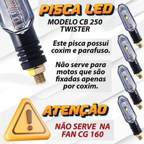 atenção não serve em fan cg 160-----somente em bros 160 Descrição Pisca led modelo cb 250 twister. atenção Este pisca possuiu coxim e parafuso. Elas não serve para motos que as setas pisca são fixados apenas por coxim Não serve em motos com setas modelo novos Aplicação: Honda cbx 250 twister. 2001 a 2008 Honda cb 300. 2009 a 2015 Honda xre 190. todas Honda titan 150 - 125. modelo abaixo de 2013 Honda fan 125 - 150. modelo abaixo de 2013 Honda nxr 160 - 150 - 125. todas Honda xr 250 tornado. todas Honda cbx 200 - 150. todas ybr 125 - 150. todas fazer 150 - 250. todas xtz 125 - 150 - 250. todas xt - tdm 225. todas Suzuki yes 125 - 150. todas Dafra speed 150. todas Obs: Serve para todas as motos que utilizem parafuso para fixação como e de parafuso pode ser adaptado em qualquer moto,nâo nos responsabilizamos por nenhuma estalaçâo ou adaptação Descrição: Produto elaborado com material de alta qualidade, testado e aprovado dentro das normas de segurança. Acompanha na embalagem: 04 pisca led. Instalação: Atenção Recomendamos que a instalação seja feita por . Não nos responsabilizamos pelo mau uso do produto,não sendo estalado como manda as orientações enviado junto ao produto e pra não funcionamento do produto,não por mal uso