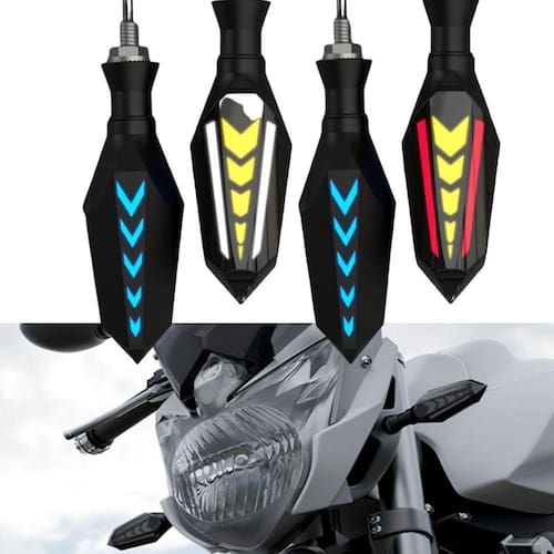 4 piscas seta de moto super led flecha esportiva universal Piscas para motos com luz de led e corpo em plástico e acrílico, na cor preta, com luz sequencial laranja e azul na parte de trás, e luz branca na frente não sequencial . Um novo modelo mais moderno para sua moto.