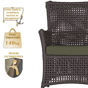A corda náutica adiciona um toque de rusticidade moderna, enquanto o estofado impermeável garante que sua poltrona esteja sempre impecável, mesmo após uma chuva inesperada ou um acidente com líquidos.