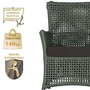 A corda náutica adiciona um toque de rusticidade moderna, enquanto o estofado impermeável garante que sua poltrona esteja sempre impecável, mesmo após uma chuva inesperada ou um acidente com líquidos.