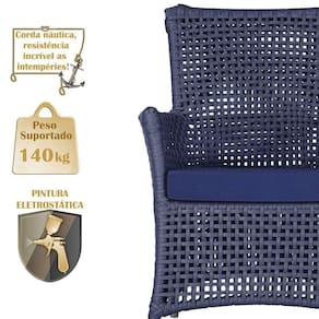 A corda nautica adiciona um toque de rusticidade moderna, enquanto o estofado impermeavel garante que sua poltrona esteja sempre impecavel, mesmo apos uma chuva inesperada ou um acidente com liquidos.
