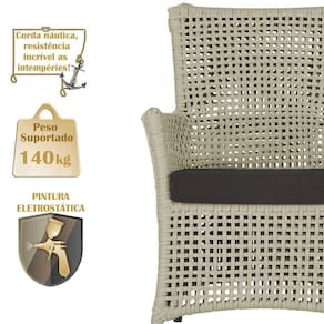 A corda nautica adiciona um toque de rusticidade moderna, enquanto o estofado impermeavel garante que sua poltrona esteja sempre impecavel, mesmo apos uma chuva inesperada ou um acidente com liquidos.