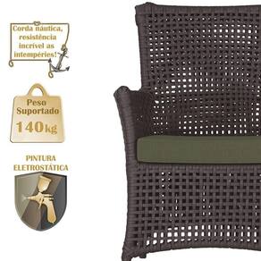 A corda nautica adiciona um toque de rusticidade moderna, enquanto o estofado impermeavel garante que sua poltrona esteja sempre impecavel, mesmo apos uma chuva inesperada ou um acidente com liquidos.