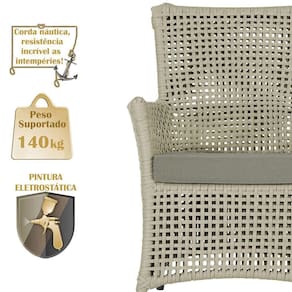 A corda nautica adiciona um toque de rusticidade moderna, enquanto o estofado impermeavel garante que sua poltrona esteja sempre impecavel, mesmo apos uma chuva inesperada ou um acidente com liquidos.