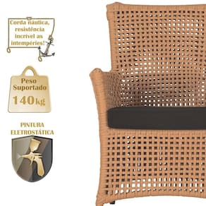 A corda nautica adiciona um toque de rusticidade moderna, enquanto o estofado impermeavel garante que sua poltrona esteja sempre impecavel, mesmo apos uma chuva inesperada ou um acidente com liquidos.