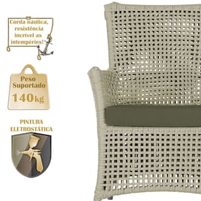 A corda náutica adiciona um toque de rusticidade moderna, enquanto o estofado impermeável garante que sua poltrona esteja sempre impecável, mesmo após uma chuva inesperada ou um acidente com líquidos.