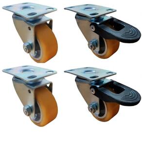 Rodizio reforçado de poliuretano placa giratória 50mmrodízio giratório em poliuretano moldado produzida com revestimento em poliuretano moldado e núcleo em alumínio fundido. Ideal para aplicações nos mais diversos tipos de superfícies e ambientes. Suporta altas cargas, protege o piso, necessita de menor esforço para movimentação, produz baixo nível de ruídos no deslocamento e tem excelente durabilidade. Possui excelente resistência a abrasão, impactos, intempéries e produtos químicos como graxas, óleos, sais e solventes. Pode ser utilizada a uma velocidade de até 4km/h. Garfo fabricado em chapa estampada e cabeçote com dupla pista de , acabamento zincado. Eixo da roda parafusado. Especificação técnica:- material da roda: poliuretano- medida da roda: 2u0022 50,8mm - medida da placa: 66mm x 48mm- altura da roda com a placa: 65mm- capacidade de peso: 100kg por roda- kit misto: 2 rodizios com freio - 2 rodizios sem freio Marca: KMB