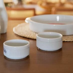 Garantia: 90 dias / Peso total: 832g / Cor predominante: branco / Ref: 7798139684255; Dimensões de cada ramekin: 9cm (D) x 4,5cm (A); Capacidade de cada ramekin: 180ml; Material: porcelana; Conteúdo: 4 ramekins de porcelana 180ml.