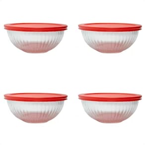 4 tigelas vidro canelada com tampa vermelha 1000ml 4 tigelas vidro borossilicato canelada com tampa vermelha 1000ml